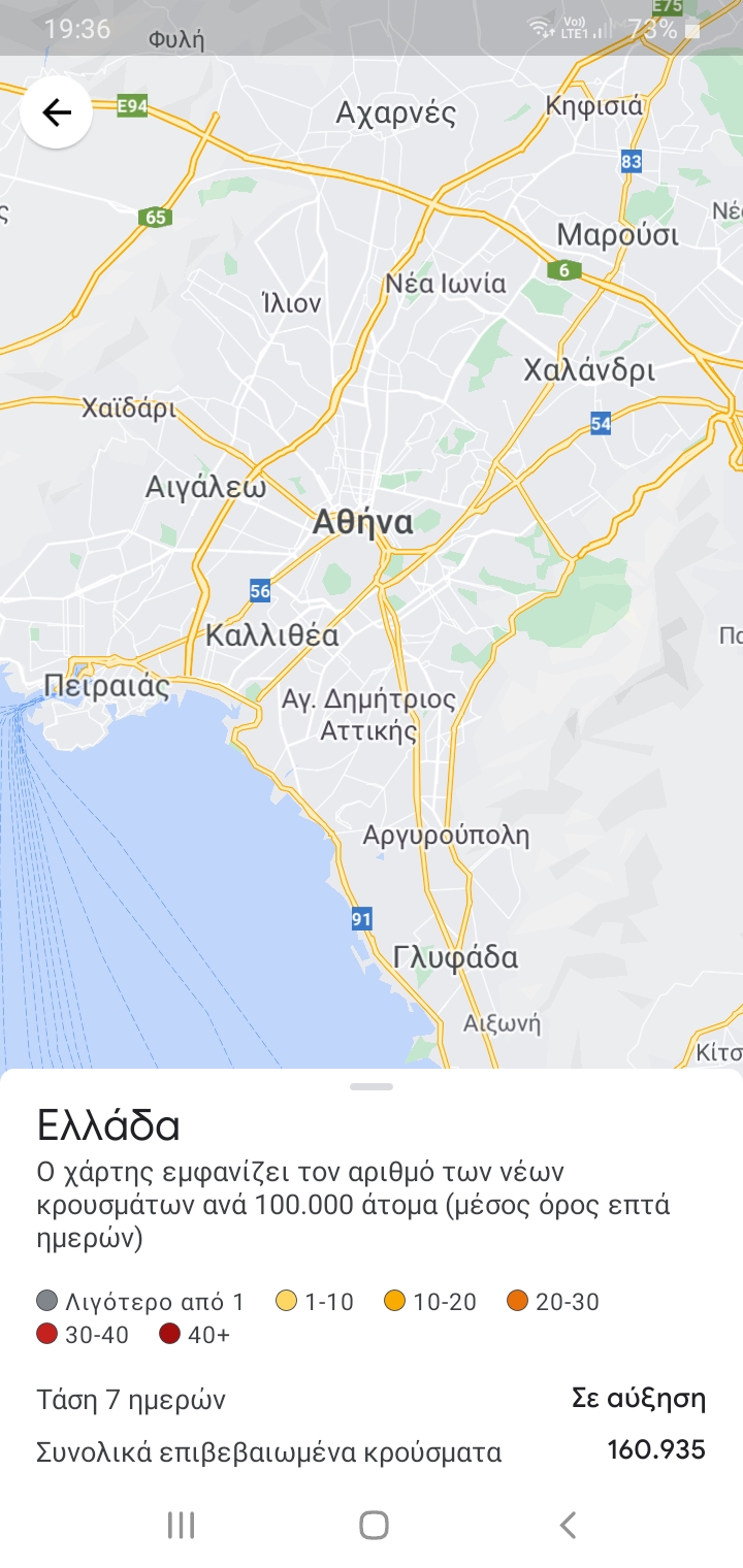 Στην εφαρμογή εμφανίζονται οι αριθμοί κρουσμάτων των τελευταίων επτά ημερών ανά 100.000 κατοίκους.