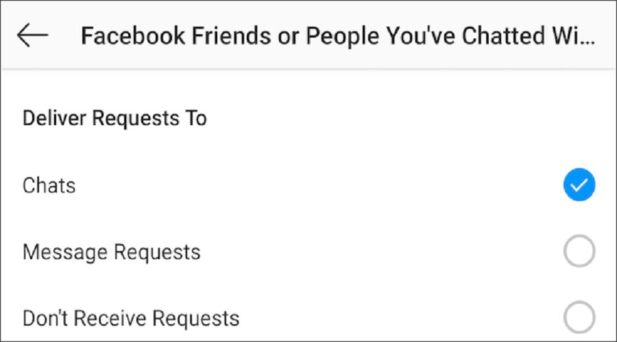 Η προεπιλεγμένη επιλογή “Συνομιλίες” (chats) επιτρέπει σε οποιονδήποτε από τους φίλους ή τους γνωστούς σας στο Facebook να σας στέλνει μήνυμα στο Instagram. Αν θέλετε να αποκλείσετε εντελώς τους φίλους από το Facebook, αλλάξετε την προεπιλεγμένη επιλογή και πατήστε στην επιλογή που λέει να “Μην λαμβάνετε αιτήματα”.