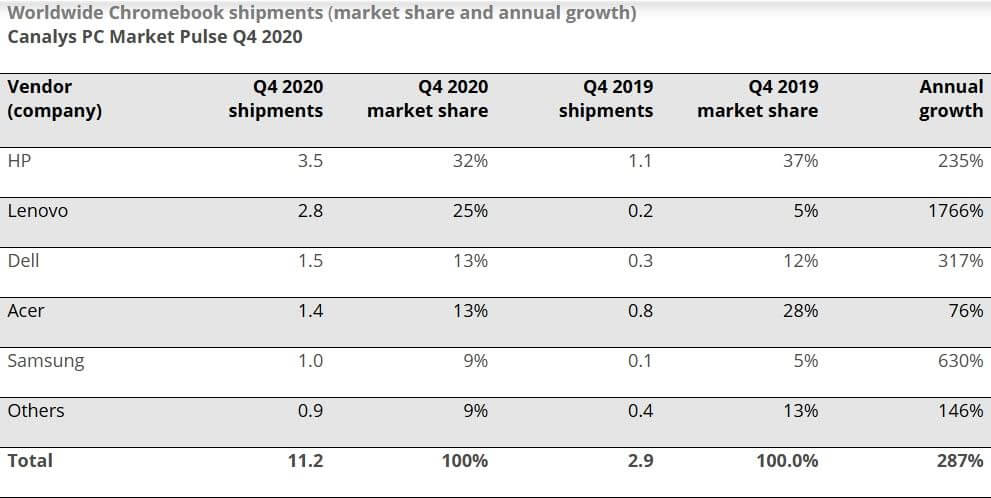 Τα πιο ενδιαφέροντα δεδομένα είναι αυτά που σχετίζονται με τα Chromebook. Κατά το τέταρτο τρίμηνο, παραδόθηκαν 11,2 εκατομμύρια μονάδες , αύξηση 287% σε σύγκριση με την ίδια περίοδο το 2019. Η Lenovo αύξησε τις αποστολές κατά 1,766%, η Samsung κατά 630%, η Dell κατά 317% και η HP κατά 235%. Η σημασία που δίνουν οι κατασκευαστές σε αυτόν τον τύπο φορητού υπολογιστή αποδεικνύεται από τις πολυάριθμες ανακοινώσεις που έγιναν στο CES 2021 στο Las Vegas. Η Google προσφέρει υπηρεσίες ειδικά για μαθητές, επομένως η δημοτικότητα του Chromebook αναμένεται να αυξηθεί τους επόμενους μήνες. Ίσως για αυτόν τον λόγο, η Microsoft αποφάσισε να αμφισβητήσει το Chrome OS με τα Windows 10X.