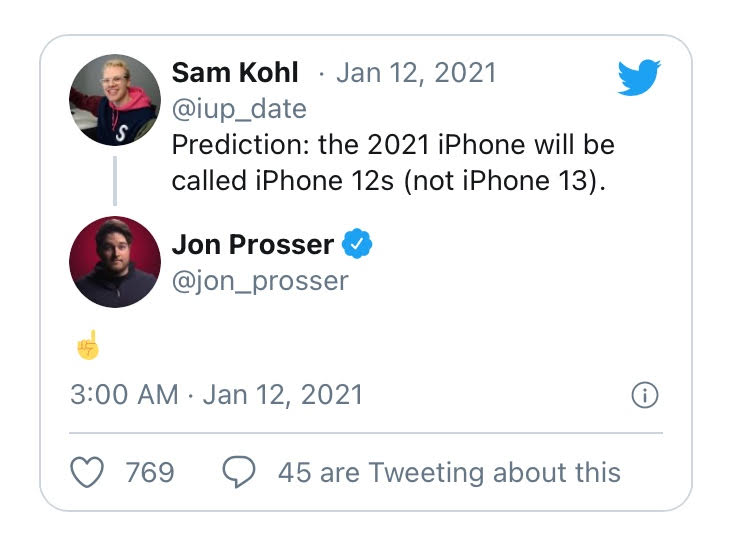 Την άποψη αυτή φαίνεται να υποστηρίζει και ο περίφημος Jon Prosser , ο οποίος σε απάντηση σε ένα tweet φαίνεται να υποστήριξε και κατ’ επέκταση να διέρρευσε τη συγκεκριμένη (μέχρι προσφάτως) υπόθεση. Επιπλέον, σε ένα από τα βίντεό του, ο ειδικός φέρεται να επιβεβαίωσε: Αλλά δεν είναι μόνο αυτό, μου είπαν επίσης ότι πιθανότατα δεν θα έχουμε ποτέ iPhone 13.